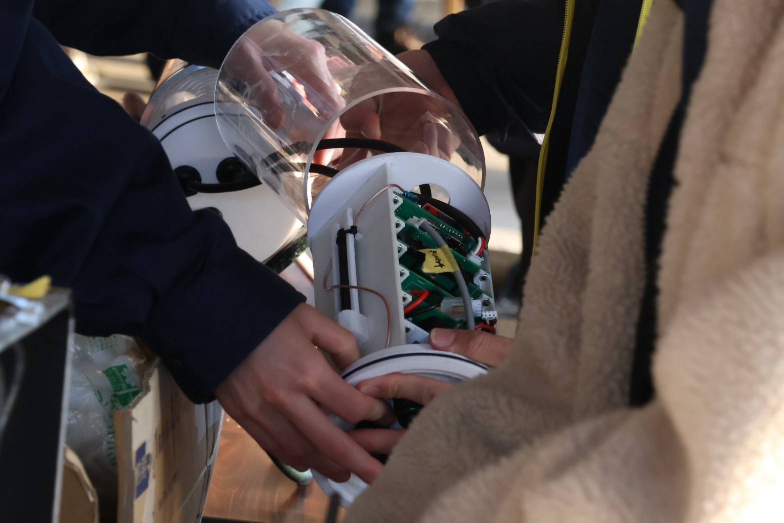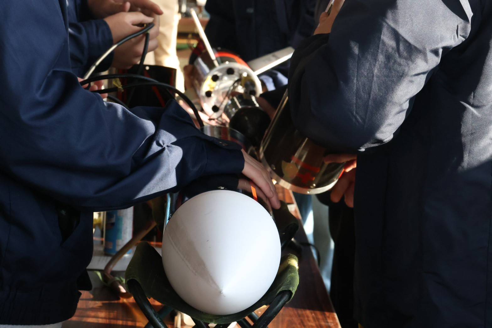 海に向かって打上げをする,海打ちでは,電装部品に影響を与えず回収できるように,水が侵入しないよう密閉をしています.